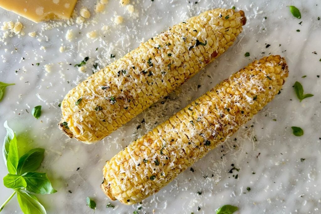• Once cooked, carefully remove the corn on the cob from the air fryer basket. Top with the remaining freshly grated Parmesan cheese and optional fresh chopped basil.