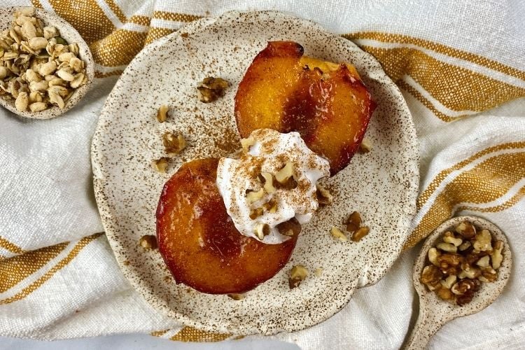 • Make It Vegan: To ensure this recipe is vegan, enjoy the air fryer peaches as is or top with vegan whipped cream.