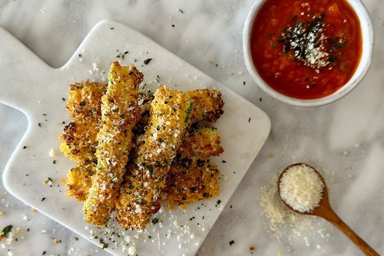 They are coated with crunchy crushed cornflakes, parmesan cheese, herbs, and spices for the perfect crunch. Air-fried to perfection, these zucchini sticks are a 10/10! Dip them in your favorite marinara sauce or dipping sauce.