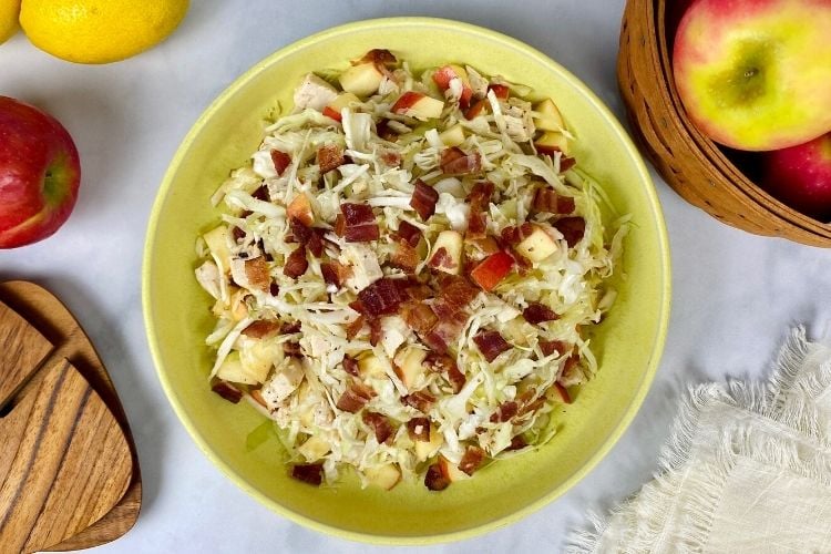 Shredded cabbage is an excellent base for a salad. We made a cabbage salad with apples, chicken, bacon, and an incredible maple vinaigrette. It is crispy, sweet, tangy, and super fresh!