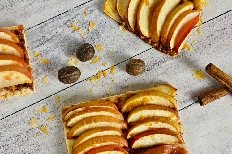 This apple tart recipe is flaky, crunchy, and flavorful! Pies have thick crusts on both the top and bottom while tarts have thinner crusts than pies. We lightened up this apple tart recipe by using phyllo pastry sheets. They are thinner than both pie and tart crusts. This makes the apple tart extra crispy!