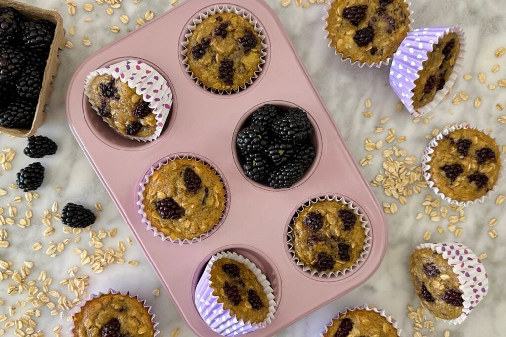 - Rolled Oats: These banana blackberry oatmeal muffins feature chewy, delicious oats for the ultimate texture.