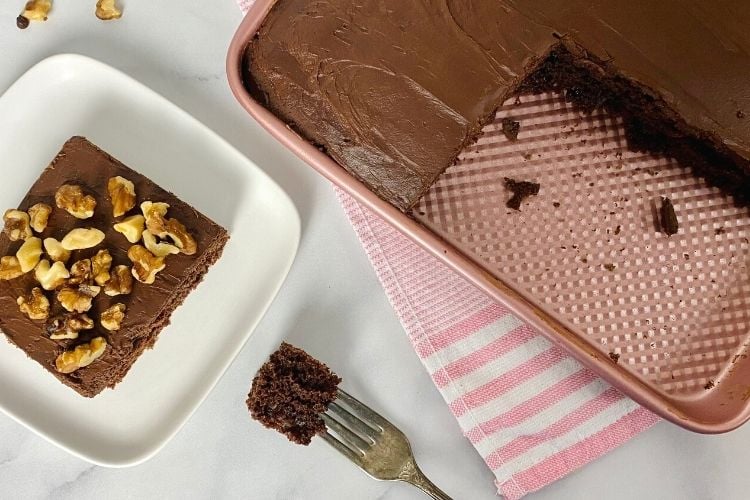 We love storing our chocolate sheet cake in the refrigerator. Make sure to store the sheet cake in an air-tight container. It will last 3-5 days in the fridge. Then, you can heat it up in the oven when you want to eat it again!