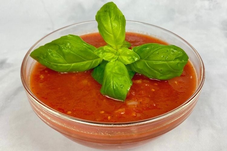 Then, pour the tomatoes into the pot with the onions. Also, you can always blend the onions if you want the sauce super smooth. At this point, taste the marinara sauce and add any extra salt to taste. After that, add the basil and let the soup simmer for 15-30 minutes to allow all of the flavors to combine. Enjoy!