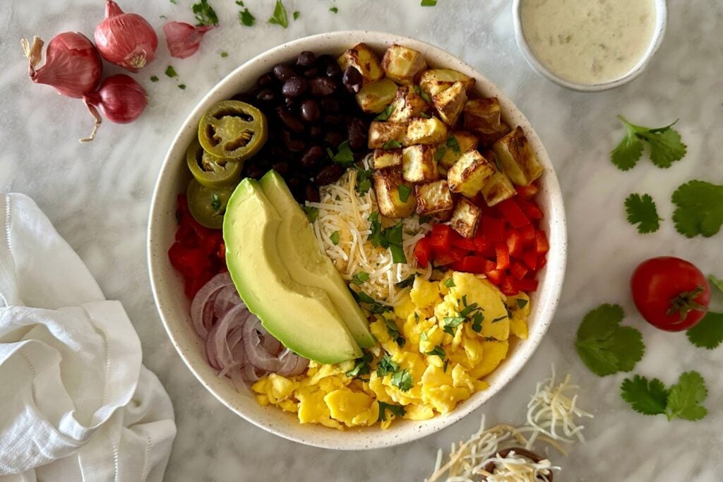 This breakfast burrito bowl is a healthier and lightened-up option. It has the flavors of a breakfast burrito without the tortilla. To make this bowl healthier, roast or air fry the potatoes.
