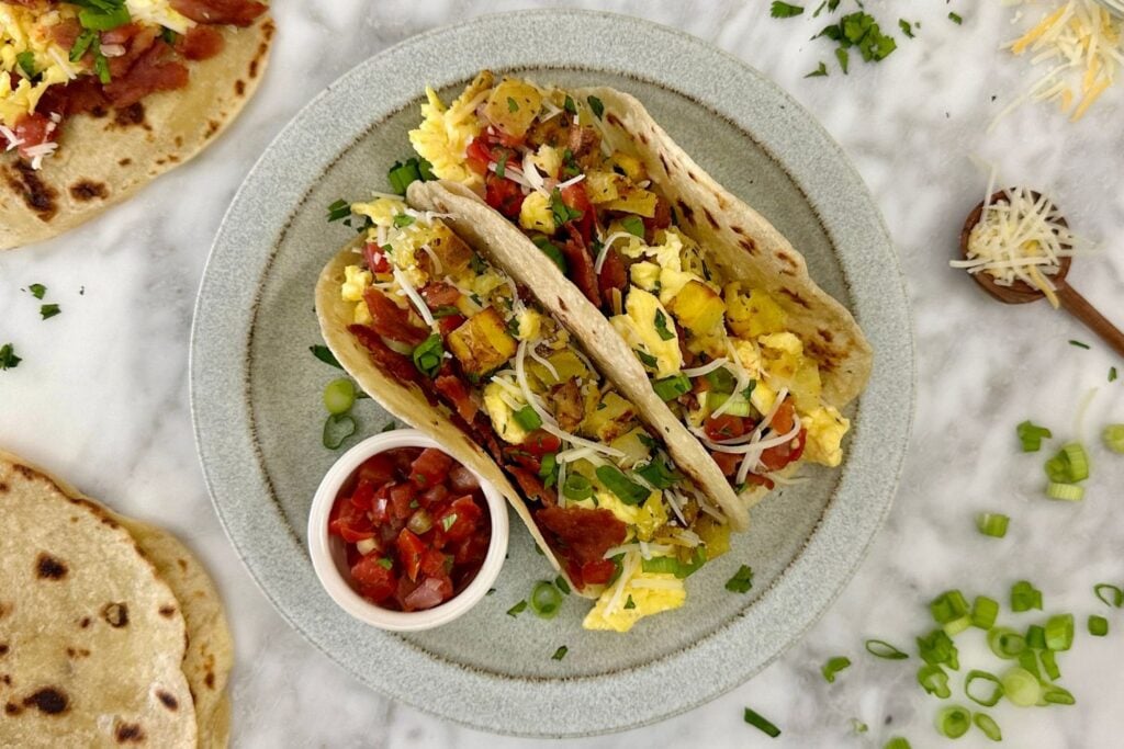 What’s not to love about tacos for breakfast? These healthy breakfast tacos are sure to become a weekly staple! It’s a flavorful combination of scrambled eggs, smoky turkey bacon, crispy potatoes, gooey cheese, and flavorful salsa all wrapped in a warm tortilla.