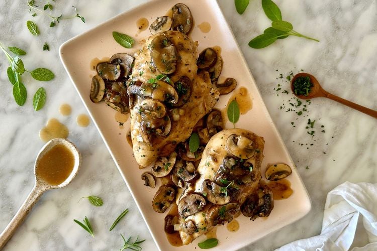 Once the chicken is fully cooked, carefully remove it from the slow cooker. Serve it on plates and top with the ingredients in the slow cooker. After that, top with dried or freshly chopped herbs and enjoy! As an option, you can shred the chicken and add it back to the slow cooker. Then, serve it on plates and enjoy! We love to serve this chicken and gravy as is or over mashed potatoes. It is also delicious with a dollop of cranberry sauce! Or, serve it over cooked rice with crispy green beans.