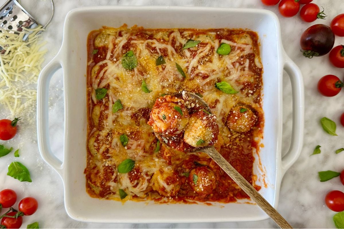 These chicken parmesan meatballs are juicy, flavorful, and incredibly easy to make! Everything comes together effortlessly in just one baking dish.