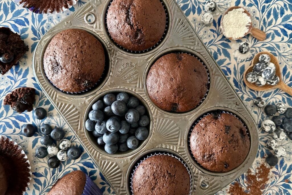 These chocolate blueberry muffins are truly irresistible! Luscious cocoa goodness and the vibrant sweetness of fresh blueberries are baked to perfection. These muffins have a moist, tender crumb with a burst of blueberry flavor in every bite.