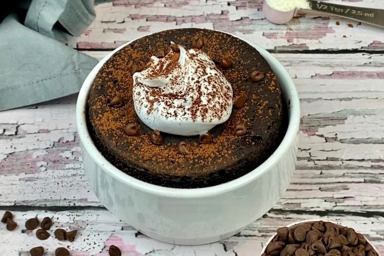 • Lightly spray a microwave-safe ramekin or mug with oil. Then, pour the mug cake batter into the ramekin or mug. Microwave the chocolate mug cake for 90 seconds on high. Optional: Top with light whipped cream and enjoy!