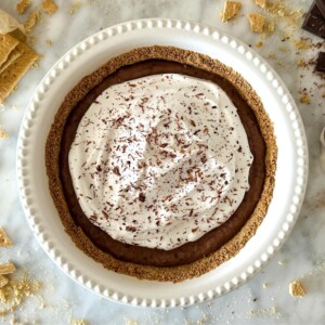 This chocolate pudding pie is a light yet decadent dessert. We made this chocolate pie with our homemade graham cracker crust for the ultimate combination of flavors. It has a rich and creamy chocolate pudding filling and is topped with fluffy whipped cream. You can top the pie with chocolate shavings for a beautiful presentation.