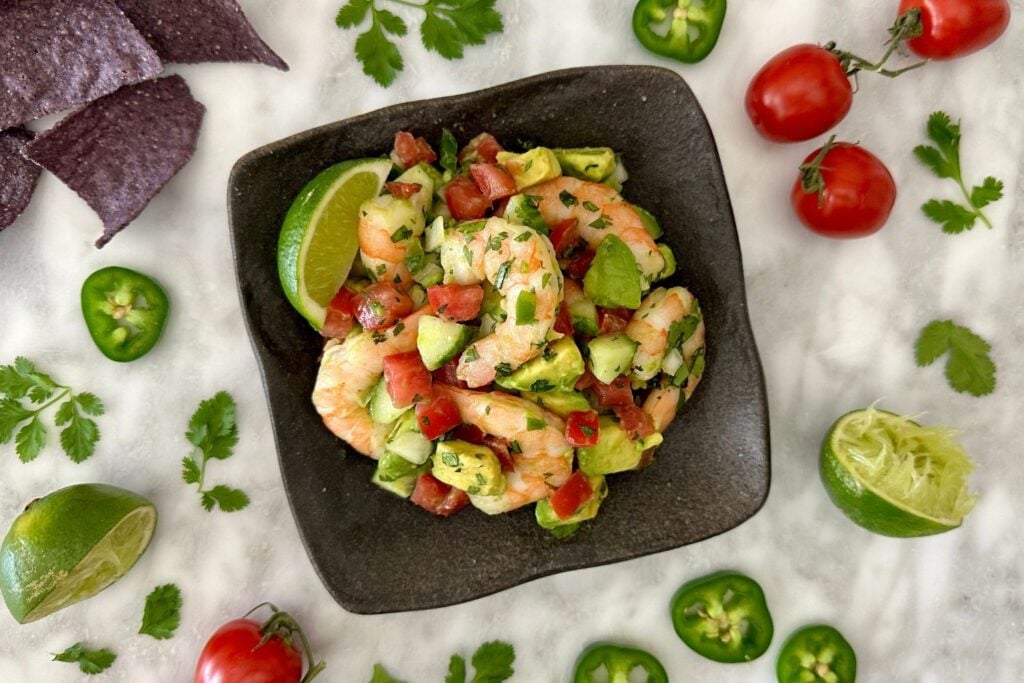 This is a must-try cucumber shrimp salad! Instead of the traditional dressing, I’ve crafted a refreshing blend of fresh ingredients. Juicy shrimp mixed with fresh tomatoes, crisp cucumbers, zesty cilantro, tangy lime, jalapeño, and creamy avocado. It’s a burst of vibrant flavors in every bite, perfect for savoring solo or scooping up with crunchy chips. This is so incredibly delicious it is not to be missed!