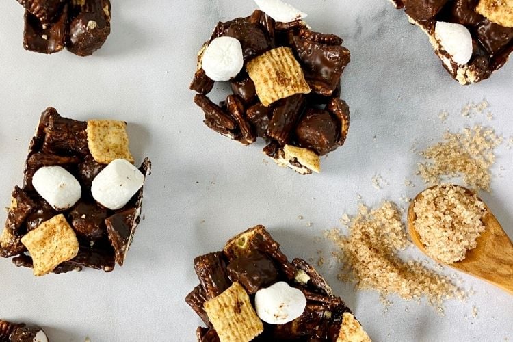 This s’mores bark with chocolate and marshmallows is delicious and easy to make! We’ve added our own special twist to this recipe by using cinnamon crunch cereal instead of graham crackers. The cereal adds so much flavor to this s’mores bark and complements the chocolate and marshmallows.