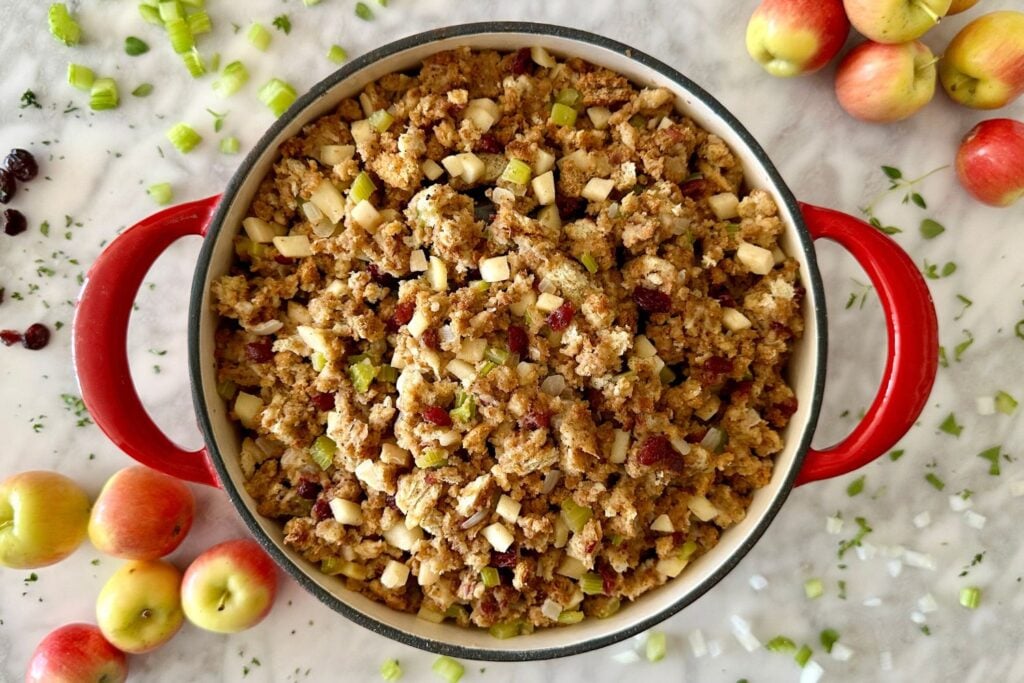 - Versatile: This stuffing can be made gluten-free, vegan, and vegetarian.