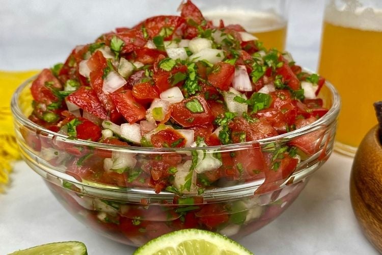 This homemade pico de gallo pairs perfectly with our healthy chicken burrito bowl, chicken and cheese enchiladas, and refreshing skinny margarita. It’s definitely worth making fresh pico de gallo!