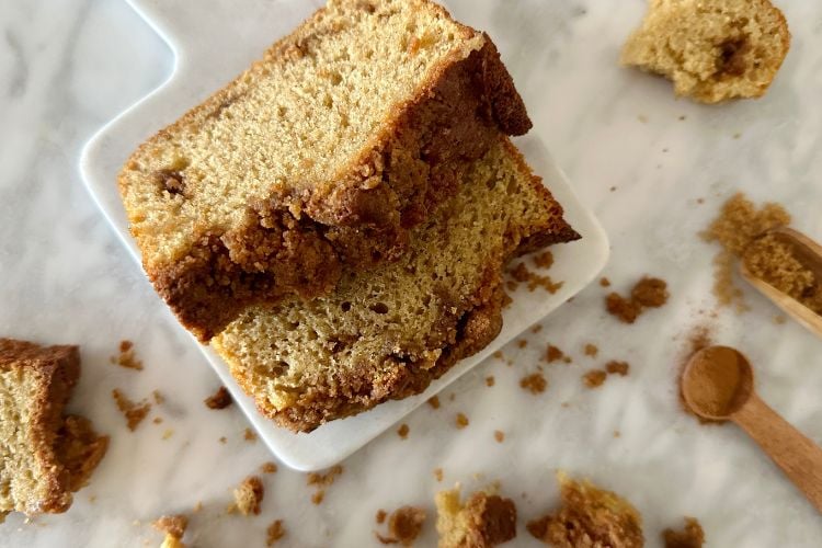 - Once cooled, carefully remove this coffee cake from the loaf pan and slice it into 8 even pieces.
