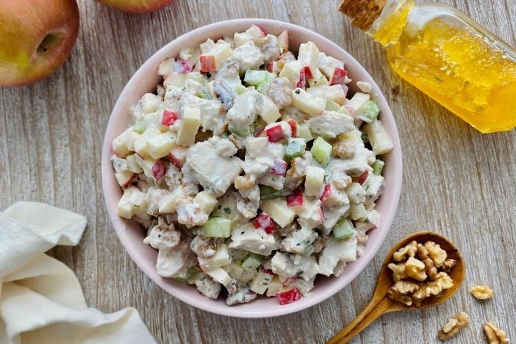 Waldorf chicken salad is a delicious salad consisting mainly of chicken, celery, apples, walnuts, and a creamy dressing. It was named after the Waldorf-Astoria Hotel in New York, where it was first served. The flavors work perfectly together, which is why this salad has become a classic staple. We have put our own special twist on this recipe by lightening it up!