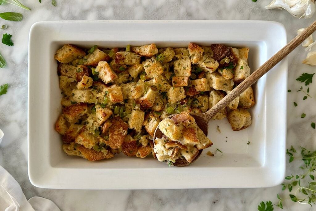 Grab your favorite loaf and if it gets a little stale, don’t toss it – transform it into this delicious, savory stuffing! Stuffing is my absolute favorite side dish for Thanksgiving, but with this recipe, I can enjoy it year-round. This small-batch version is fantastic for those times when you’re craving stuffing outside of the holidays, whether it’s for a comforting dinner for two or a smaller gathering. With fresh herbs and a simple ingredient list, this stuffing is quick to make yet packed with flavor. It’s perfect alongside roasted chicken, pork, or even on its own as a comforting side.