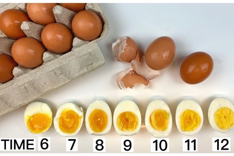 If you want to make soft-boiled eggs, the eggs should boil on the stove in a saucepan for 6-8 minutes. Boil your eggs for 10-12 minutes if you want hard-boiled eggs. We broke this down even further to show you what the eggs look like at each minute from 6-12 minutes.