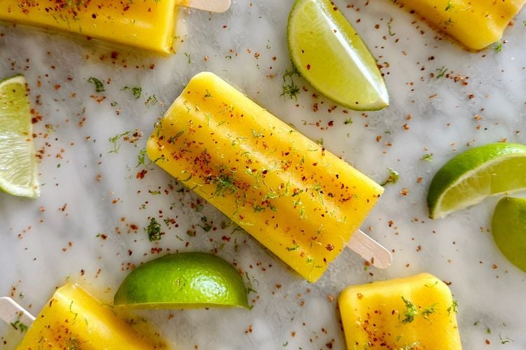 Tajin chile lime seasoning is often sprinkled on fresh mango because the flavors are delicious together. We love sprinkling some on these mango popsicles!
