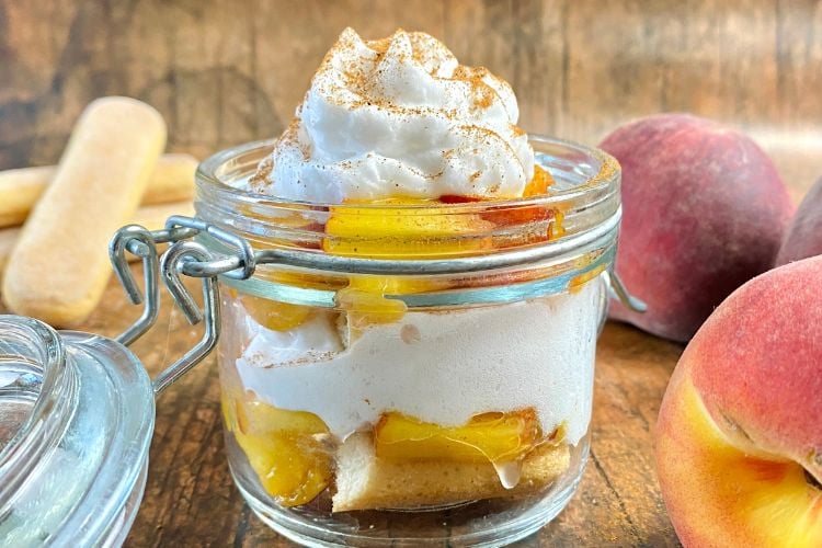 Looking for the best way to enjoy fresh peaches this summer? This peach tiramisu recipe is packed with ripe sweet peaches, ladyfingers, and whipped cream! It is the perfect no-bake summer dessert and you can make individual servings. This single-serving recipe is easy to assemble and enjoy in a jar. It is ready for you when the craving hits.