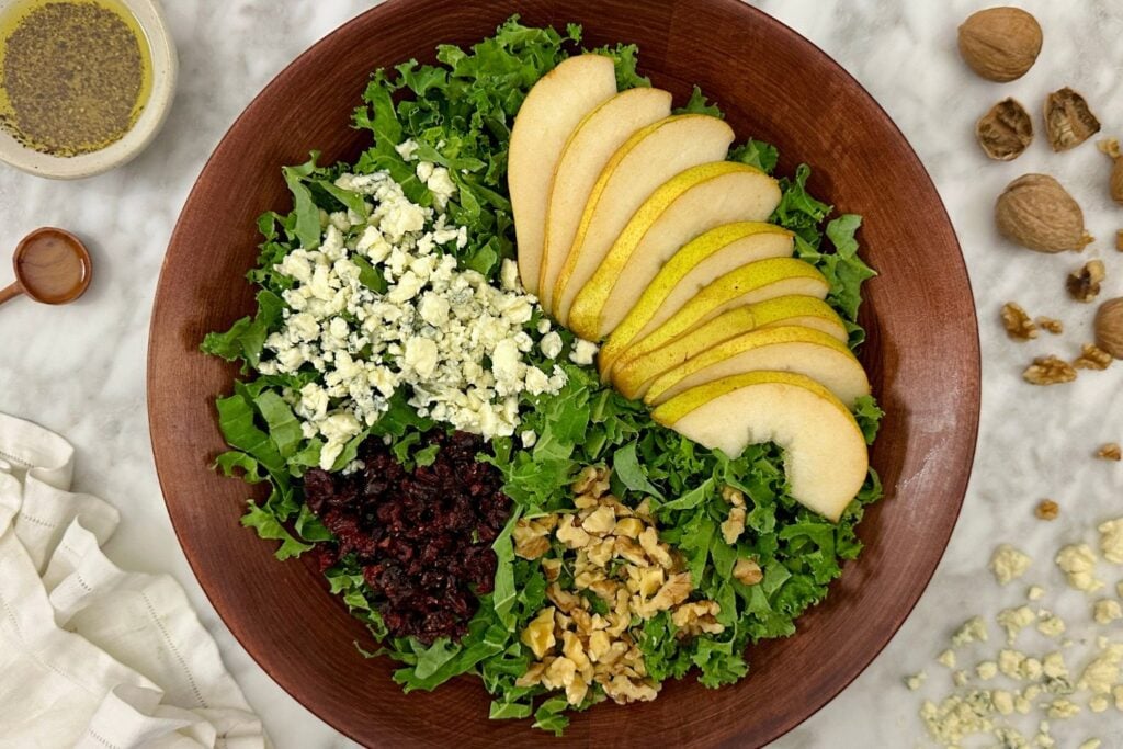 - Assemble the salad. Add the chopped kale to a large bowl. Then, add the sliced pears, crumbled blue cheese, chopped walnuts, and dried cranberries. After that, pour the dressing over the salad and toss to combine all the ingredients. From there, serve the salad and enjoy!