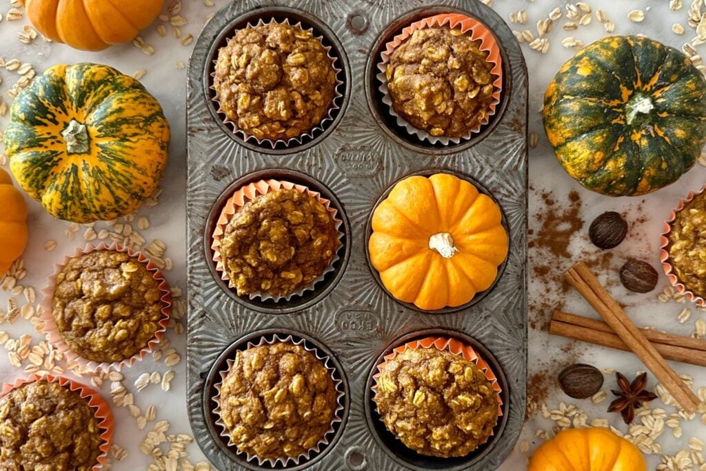 These pumpkin oat muffins are a healthier option! The combination of 0-fat Greek yogurt, unsweetened applesauce, and pumpkin puree adds moisture and softness without any butter or oil. Also, using oats instead of traditional all-purpose flour boosts the fiber content, making these muffins a more nutritious treat.