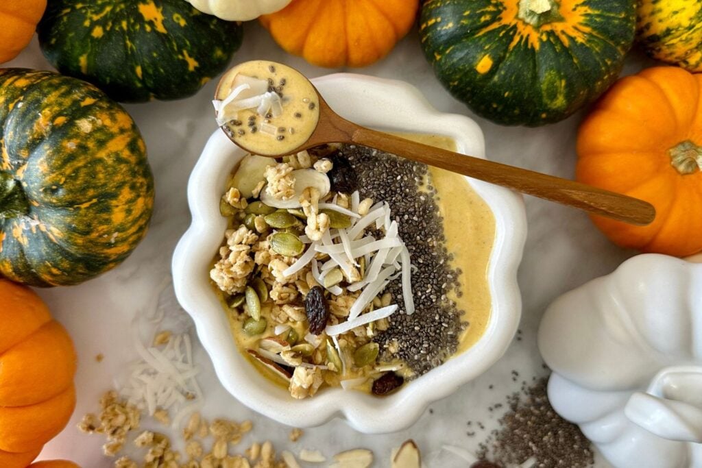 There are so many ways to serve this pumpkin yogurt! You can make a pumpkin yogurt parfait with layers of fruit and granola, or make a yogurt bowl with your favorite toppings.