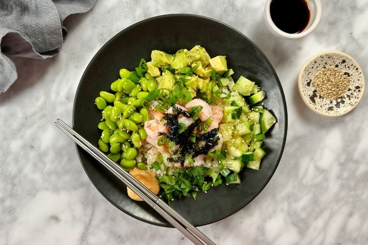 • Divide everything between two bowls when assembling. To assemble the bowls, add the rice, cooked shrimp, cucumber, cilantro, green onions, avocado, and edamame. Pour the low-sodium soy sauce or tamari on top if you did not already mix it with the rice. Then, add the spicy mayonnaise and enjoy!
