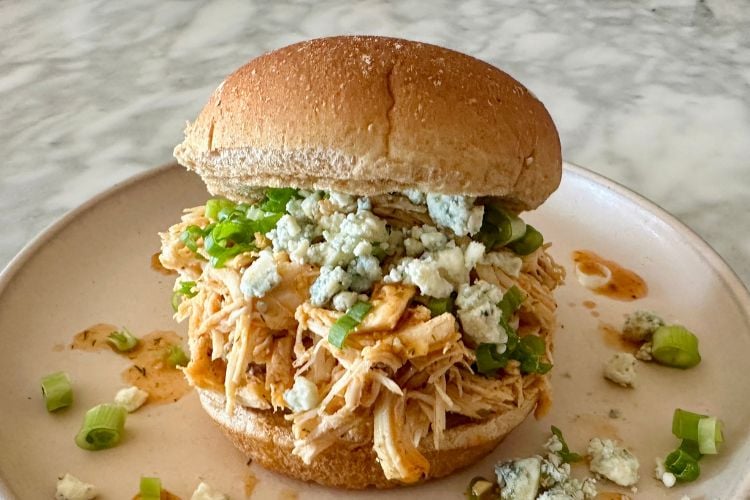 Step 5: Once shredded, pour the sauce from the slow cooker over the chicken so you can control how much you add and how spicy it will be. Then, top with sliced green onions and crumbled blue cheese.