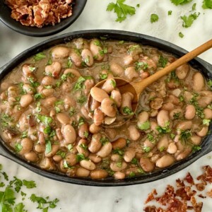 These charro beans are delicious as is or with additional toppings. Some delicious topping ideas are crumbled cotija or feta cheese, Pico de Gallo, sliced avocado, Greek yogurt, sour cream, or sliced green onions.