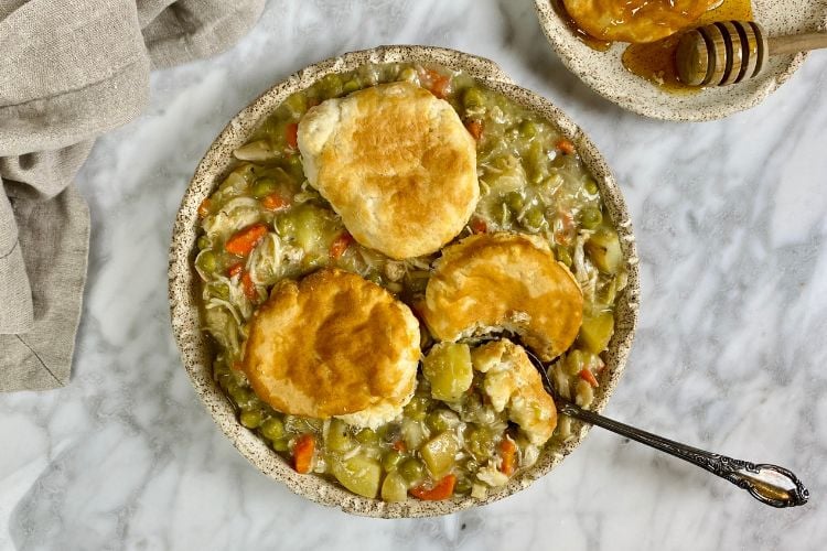 Nothing screams comfort food more than chicken pot pie! I took traditional chicken pot pie and made a chicken pot pie soup. It is lightened up and oh-so-easy to make in the Crockpot. Also, this soup is so warm and creamy. It’s bursting with flavors and comfort! Just dump and go and have an incredibly delicious meal waiting for you when you get home. Once ready, we love to top it with our favorite biscuits.