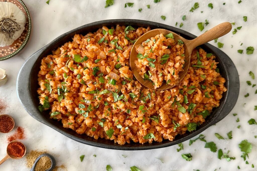 - Remove the Spanish cauliflower rice from the heat and garnish with chopped fresh cilantro. Serve it as a side dish with your favorite Mexican meal or enjoy it as a standalone dish.