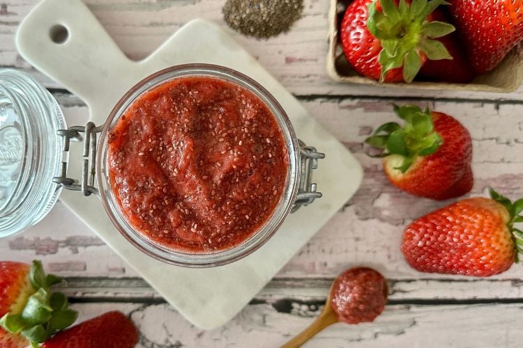 Yes, strawberry chia jam is healthy! You only need a small amount of sugar or your sweetener of choice in this recipe and you could even omit the sweetener altogether if your strawberries are sweet enough. This jam is much healthier than many sugary store-bought jams. Also, there are many benefits of chia seeds.