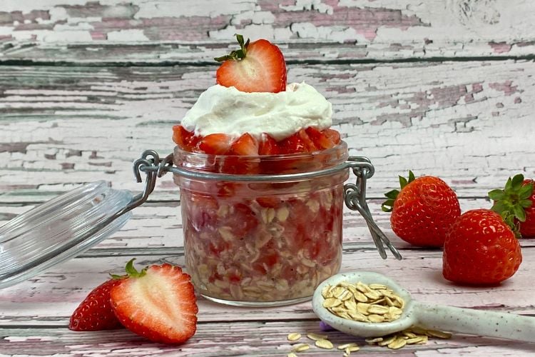 These overnight oats have the flavors of strawberry shortcake! They are packed with lightly mashed fresh strawberries. Also, we like to add whipped cream on top!