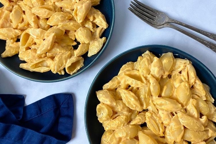 Serve the cheese sauce with your favorite cooked pasta or pasta alternative. Thoroughly mix the mac and cheese and heat it up in a large saucepan on the stove. Then, transfer this mac and cheese to bowls and serve. You can serve mac and cheese as a main dish or as a side dish! We like to serve this mac and cheese with cornflake chicken tenders, balsamic roasted brussels sprouts, and carrot apple salad.