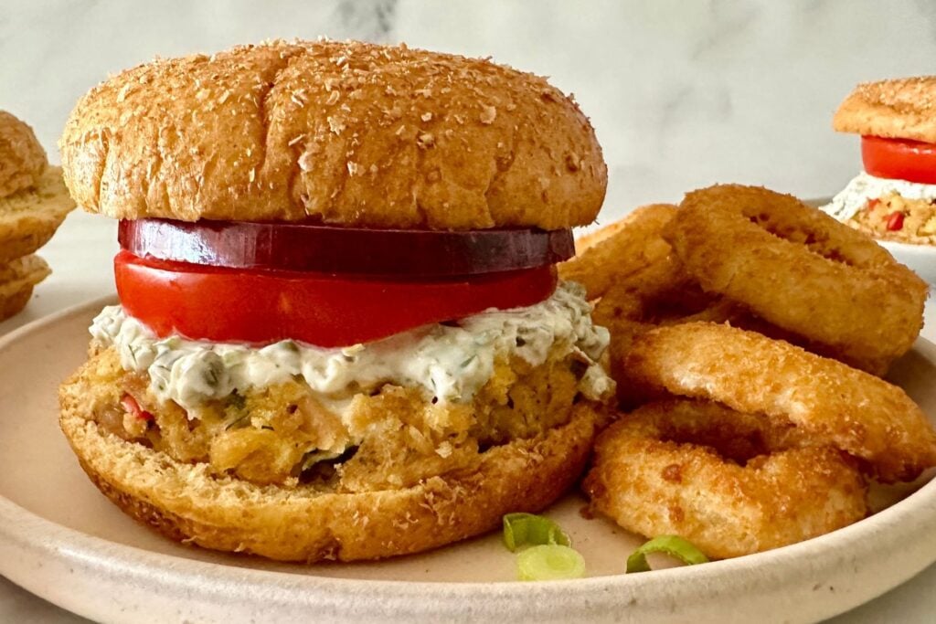 Tuna burgers contain patties made from canned tuna, breadcrumbs, seasonings, and eggs to form a flavorful mixture. Then, the patties are baked in the oven and served on a bun, just like a traditional burger. They’re a fantastic way to use pantry staples like canned tuna and can be topped with various toppings, such as our healthy tartar sauce.